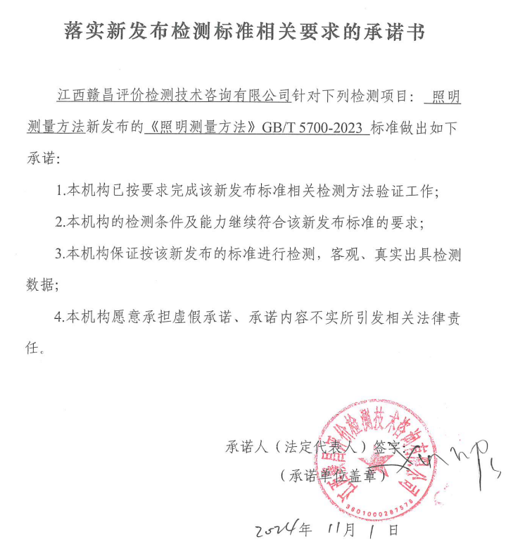關(guān)于落實(shí)新發(fā)布檢測(cè)標(biāo)準(zhǔn)(照明測(cè)量方法)相關(guān)要求承諾書