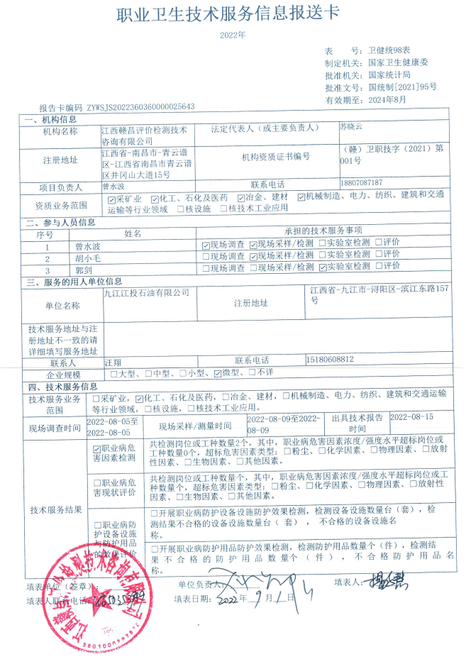 九江江投石油有限公司加油站工作場(chǎng)所職業(yè)病危害因素檢測(cè)報(bào)告