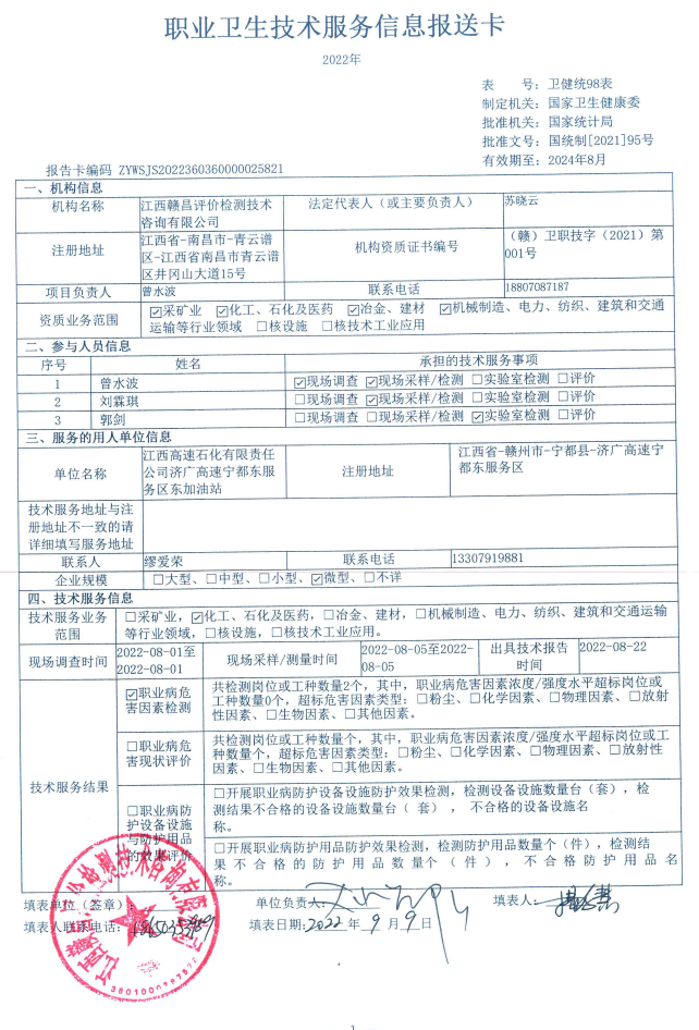 江西高速石化有限責任公司濟廣高速寧都東服務(wù)區(qū)東加油站工作場所職業(yè)病危害因素檢測報告
