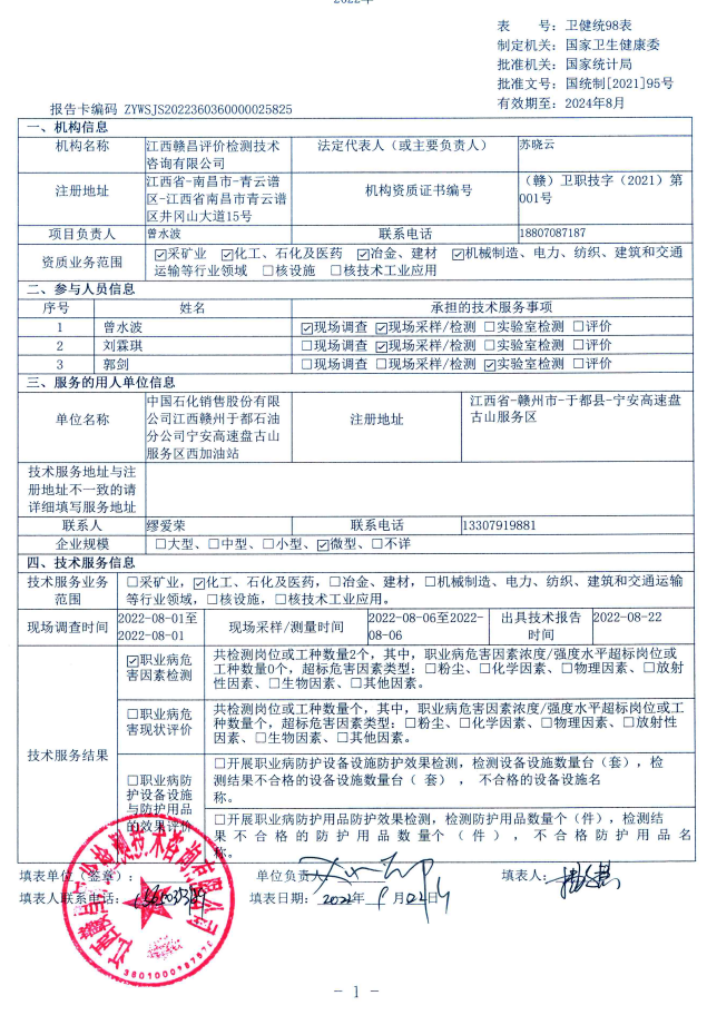 下一篇:中國石化銷售股份有限公司江西贛州于都石油分公司寧安高速盤古山服務區(qū)東加油站工作場所職業(yè)病危害因素檢測