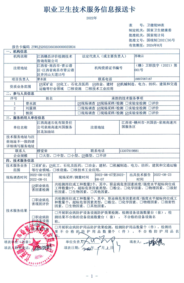 下一篇:江西高速石化有限責(zé)任公司泉南高速興國服務(wù)區(qū)南加油站工作場(chǎng)所職業(yè)病危害因素檢測(cè)報(bào)告