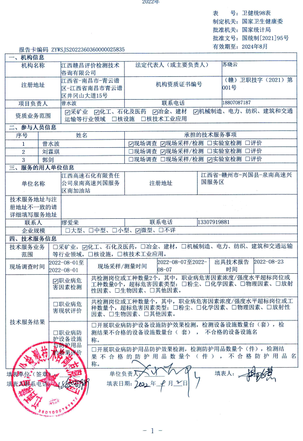 江西高速石化有限責(zé)任公司泉南高速興國(guó)服務(wù)區(qū)南加油站工作場(chǎng)所職業(yè)病危害因素檢測(cè)報(bào)告