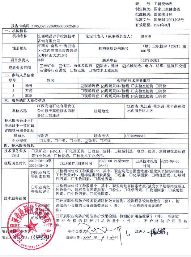 上一篇:江西高速石化有限責(zé)任公司武吉高速修水服務(wù)區(qū)東加油站工作場所職業(yè)病危害因素檢測報告