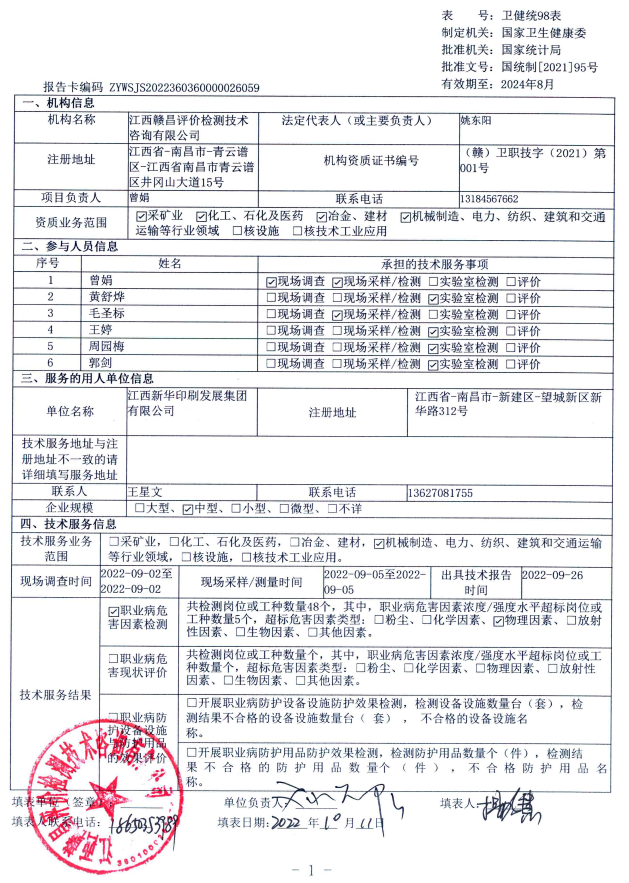 江西新華印刷發(fā)展集團有限公司工作場所職業(yè)病危害因素檢測報告