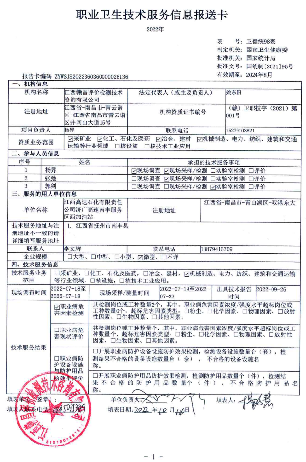 下一篇:江西高速石化有限責(zé)任公司昌寧高速永豐南服務(wù)區(qū)東加油站工作場(chǎng)所職業(yè)病危害因素檢測(cè)報(bào)告