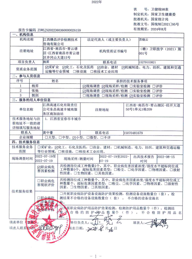 江西高速石化有限責任公司東昌高速豐城南服務(wù)區(qū)南加油站工作場所職業(yè)病危害因素檢測報告