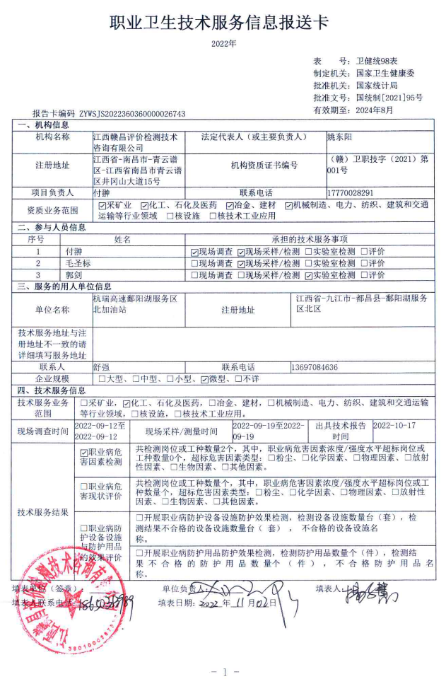 上一篇:江西高速石化有限責(zé)任公司杭瑞高速鄱陽湖服務(wù)區(qū)南加油站工作場所職業(yè)病危害因素檢測報告