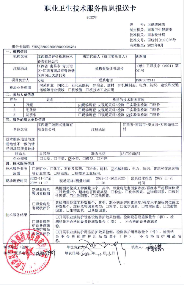江西建工裝配式建筑有限責(zé)任公司工作場所職業(yè)病危害因素檢測報告