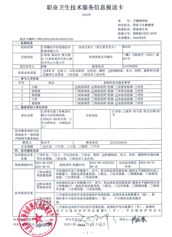 江西省交通工程集團有限公司昌景黃鐵路CJHZQJX-5標項目部一工區(qū)1#拌和站、1#鋼筋加工廠,二工區(qū)(梁場)2#鋼筋加工廠、3#鋼筋加工廠、2#拌和站工作場所職業(yè)病危害因素檢測報告