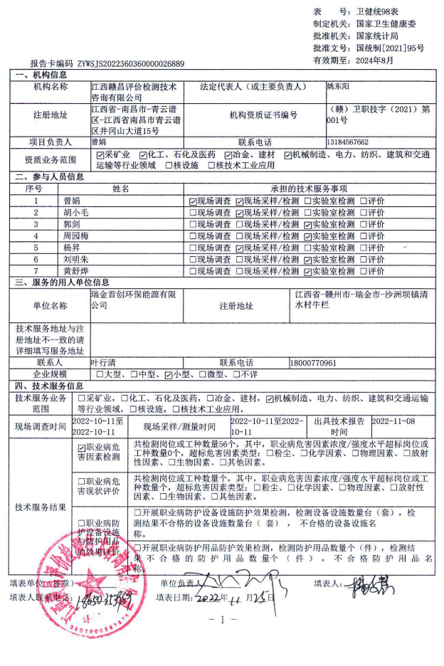 瑞金首創(chuàng)環(huán)保能源有限公司工作場所職業(yè)病危害因素檢測報告
