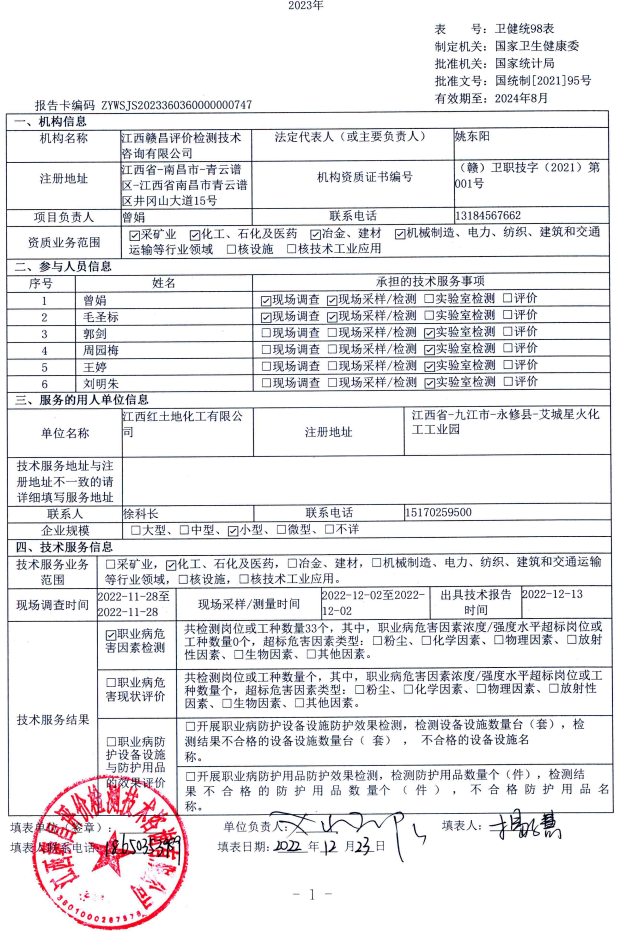 江西紅土地化工有限公司工作場所職業(yè)病危害因素檢測報(bào)告