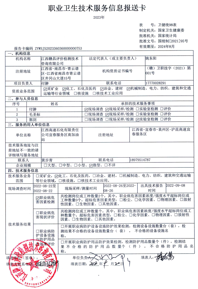 江西高速石化有限責任公司滬昆高速宜春服務區(qū)南加油站工作場所職業(yè)病危害因素檢測報告