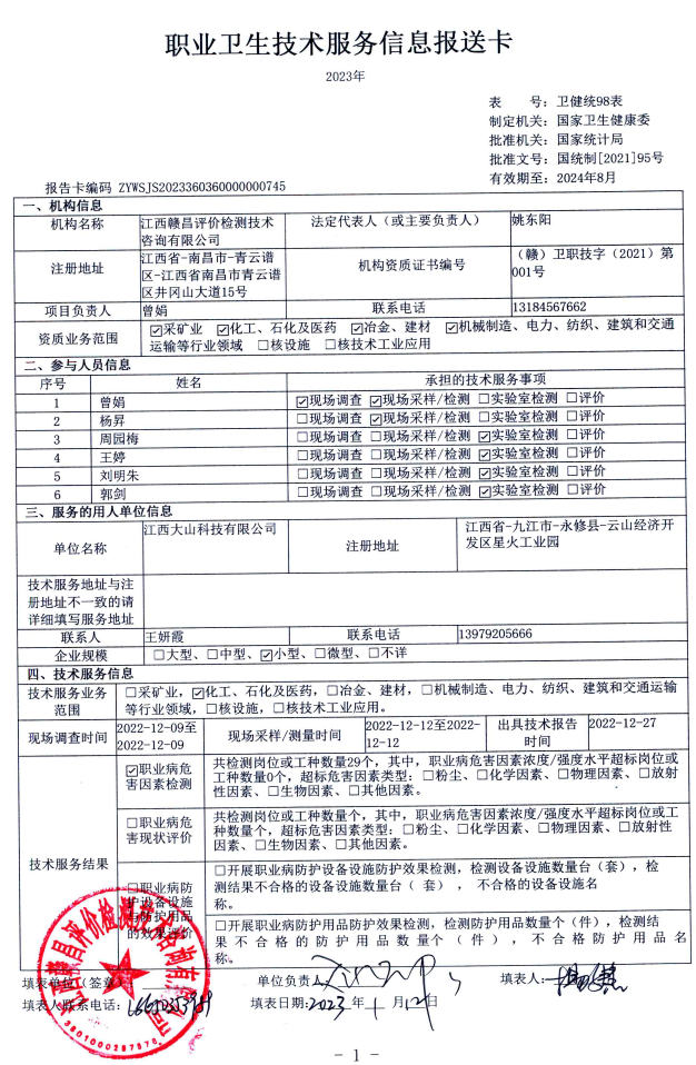 江西大山科技有限公司工作場所職業(yè)病危害因素檢測報(bào)告