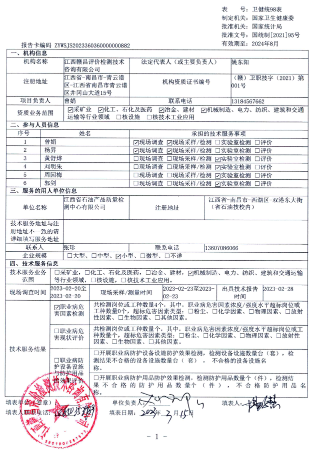 江西省石油產(chǎn)品質(zhì)量檢測(cè)中心有限公司工作場(chǎng)所職業(yè)病危害因素檢測(cè)報(bào)告