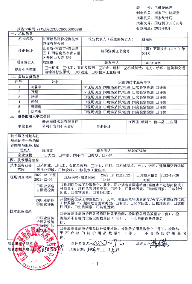 贛州海螺水泥有限責(zé)任公司石古前石灰?guī)r礦工作場所職業(yè)病危害因素檢測報告