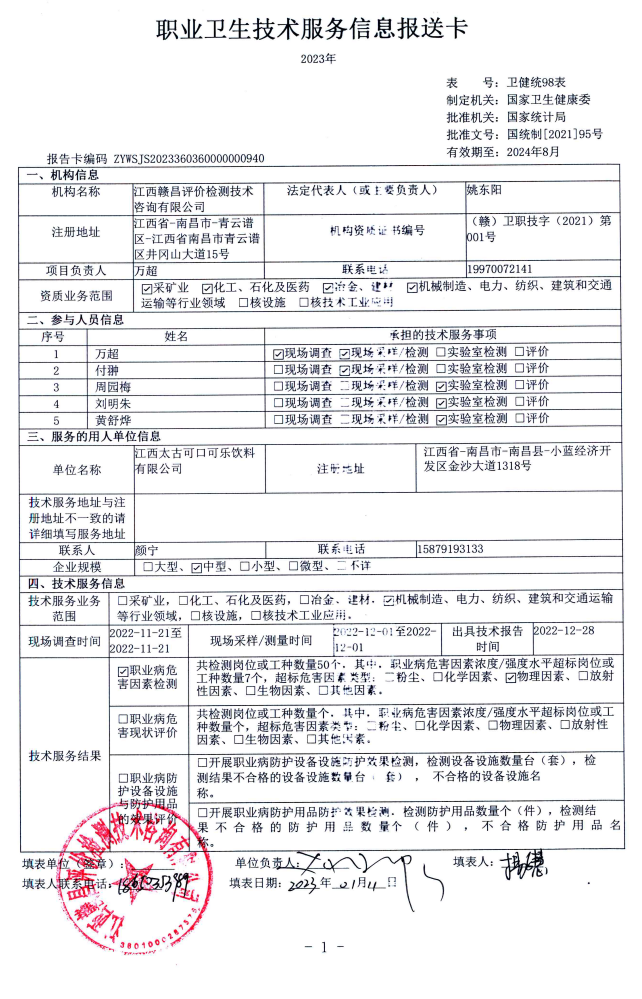 江西太古可口可樂飲料有限公司工作場所職業(yè)病危害因素檢測報告