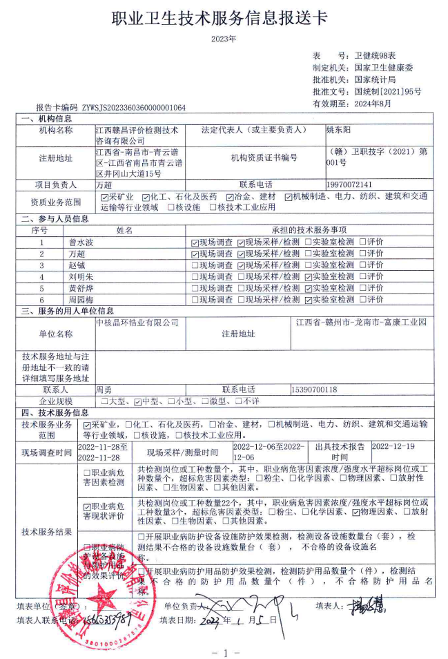中核晶環(huán)鋯業(yè)有限公司工作場所職業(yè)病危害因素檢測報告