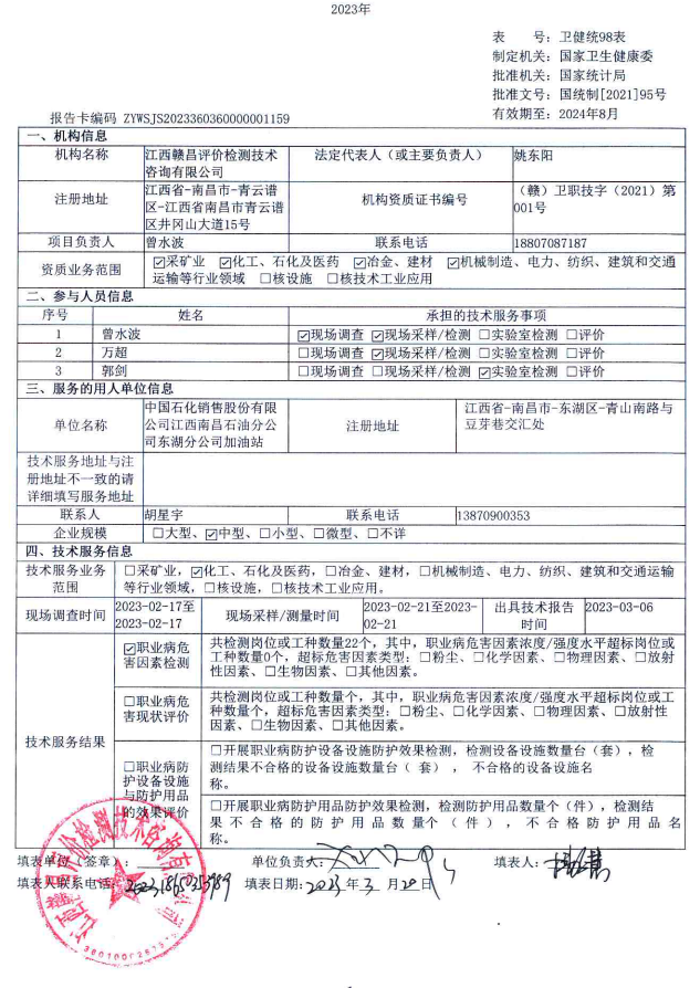 中國石化銷售股份有限公司江西南昌石油分公司東湖分公司加油站工作場所職業(yè)病危害因素檢測報告