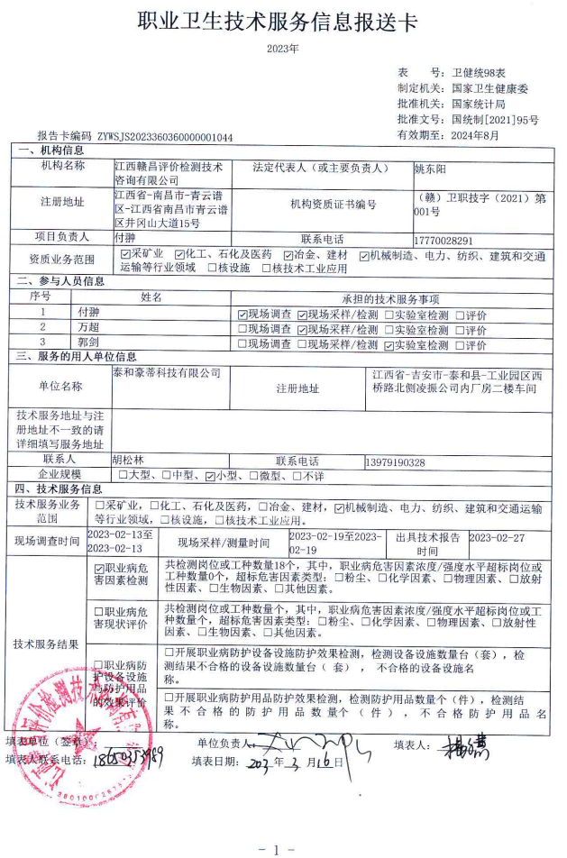 泰和豪蒂科技有限公司工作場所職業(yè)病危害因素檢測報(bào)告