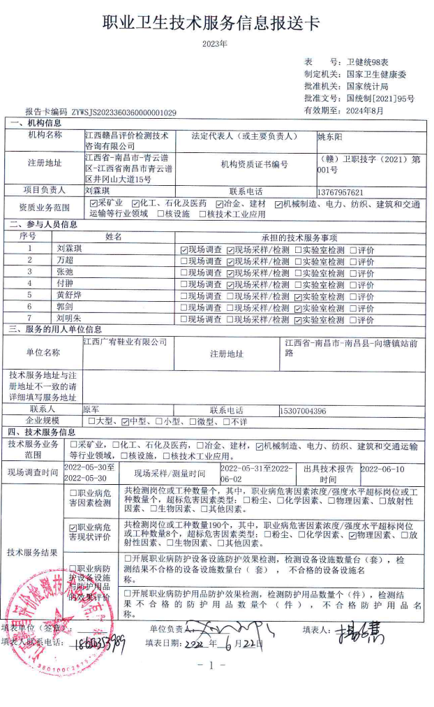江西廣宥鞋業(yè)有限公司工作場(chǎng)所職業(yè)病危害因素檢測(cè)報(bào)告
