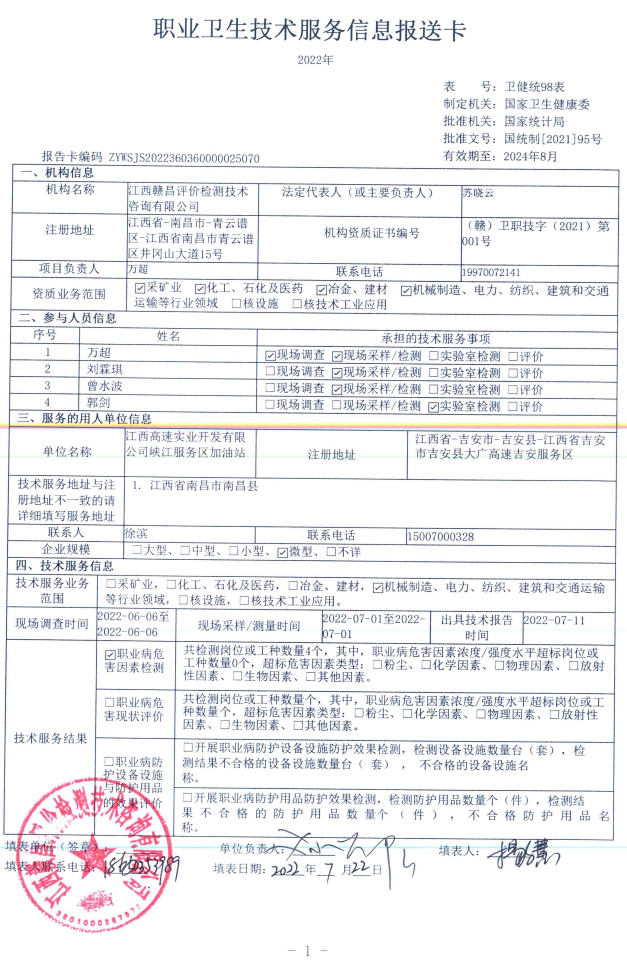 江西高速實(shí)業(yè)開發(fā)有限公司峽江服務(wù)區(qū)加油站工作場所職業(yè)病危害因素檢測報(bào)告