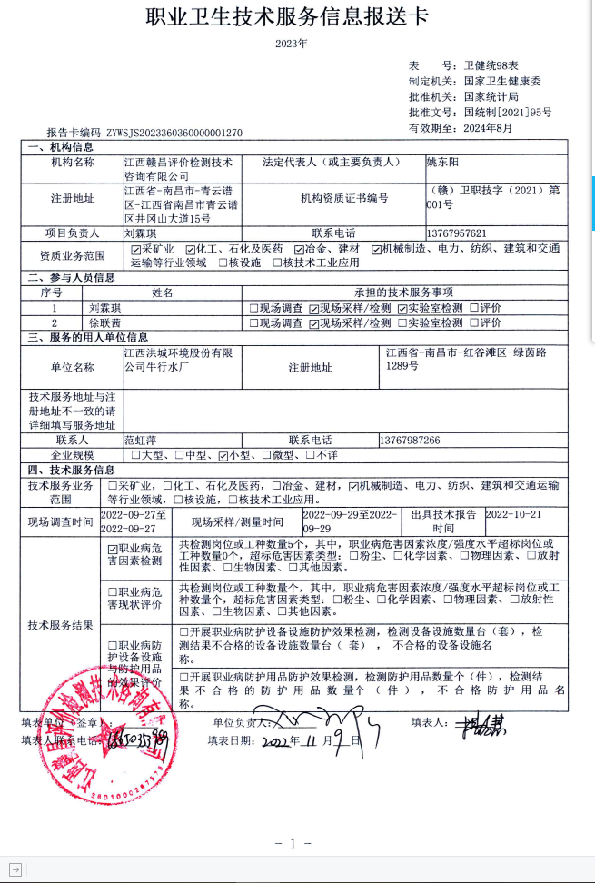 江西洪城環(huán)境股份有限公司牛行水廠工作場所職業(yè)病危害因素檢測報(bào)告