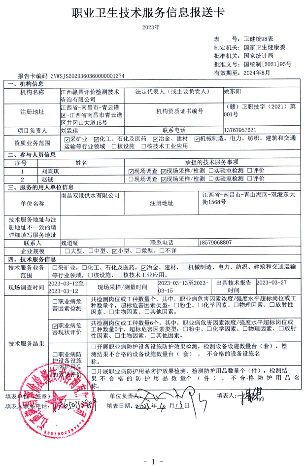 南昌雙港供水有限公司工作場(chǎng)所職業(yè)病危害因素檢測(cè)報(bào)告