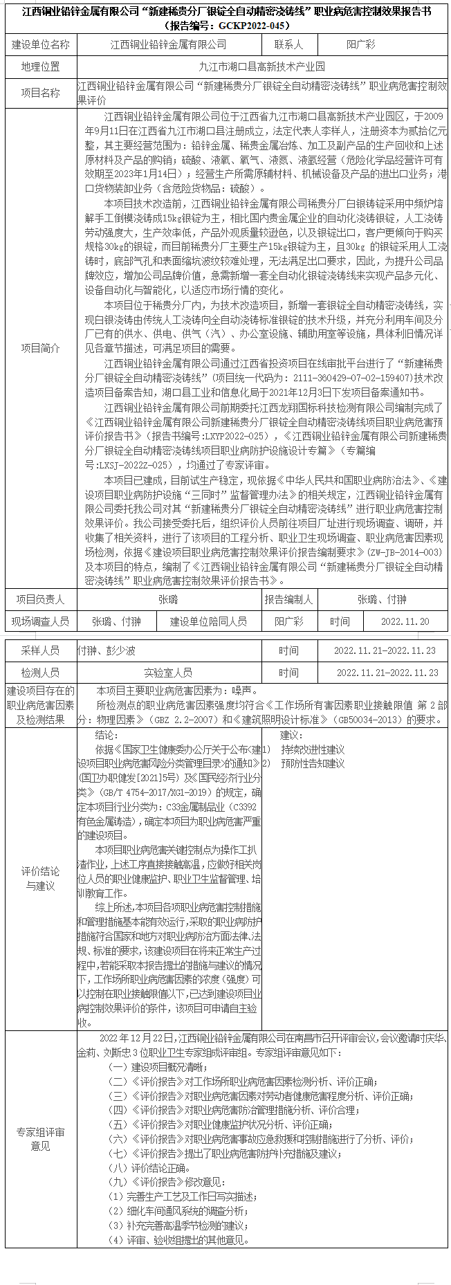 江西銅業(yè)鉛鋅金屬有限公司“新建稀貴分廠銀錠全自動(dòng)精密澆鑄線”職業(yè)病危害控制效果報(bào)告