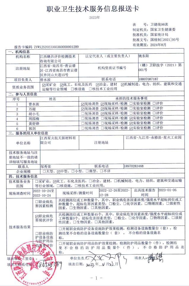 江西星火航天新材料有限公司工作場所職業(yè)病危害因素檢測報告