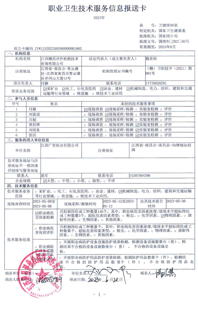 江西廣宥鞋業(yè)有限公司工作場所職業(yè)病危害因素檢測報(bào)告