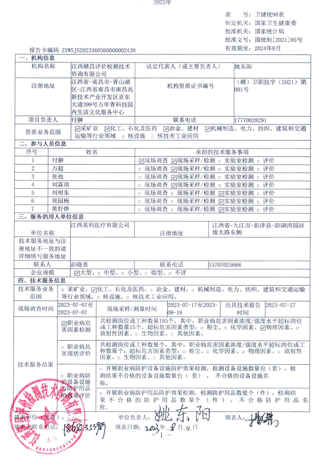 江西英科醫(yī)療有限公司年產(chǎn)271.68億只(2744萬箱)高端醫(yī)用手套項(xiàng)目(一期40條丁腈生產(chǎn)線)工作場所職業(yè)病危害因素檢測報(bào)告