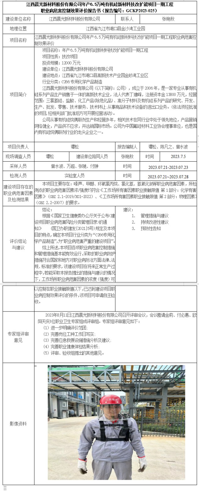 江西晨光新材料股份有限公司年產6.5萬噸有機硅新材料技改擴能項目一期工程 職業(yè)病危害控制效果評價報告書(報告編號:GCKP2023-025)