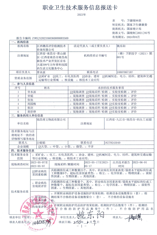瑞昌理文物流有限公司工作場所職業(yè)病危害因素檢測報告
