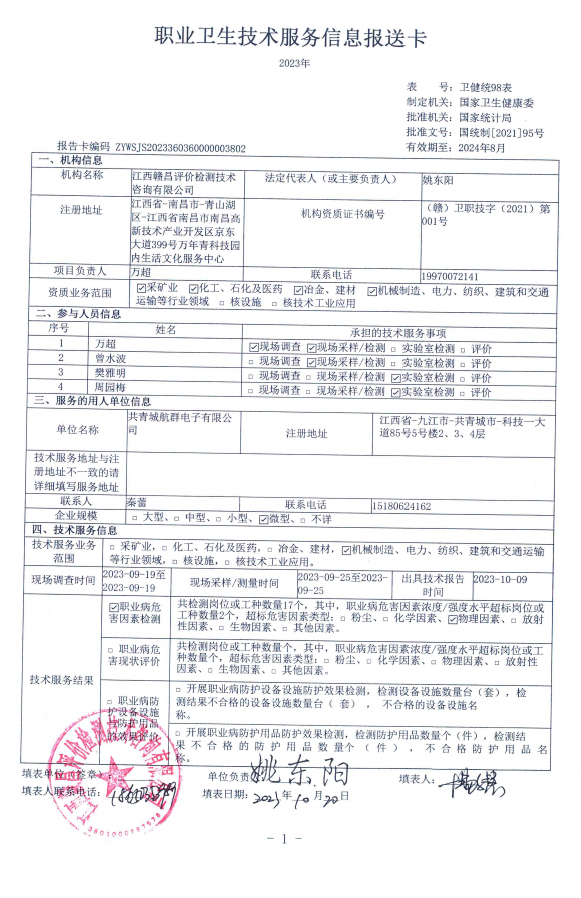 共青城航群電子有限公司工作場所職業(yè)病危害因素檢測報告