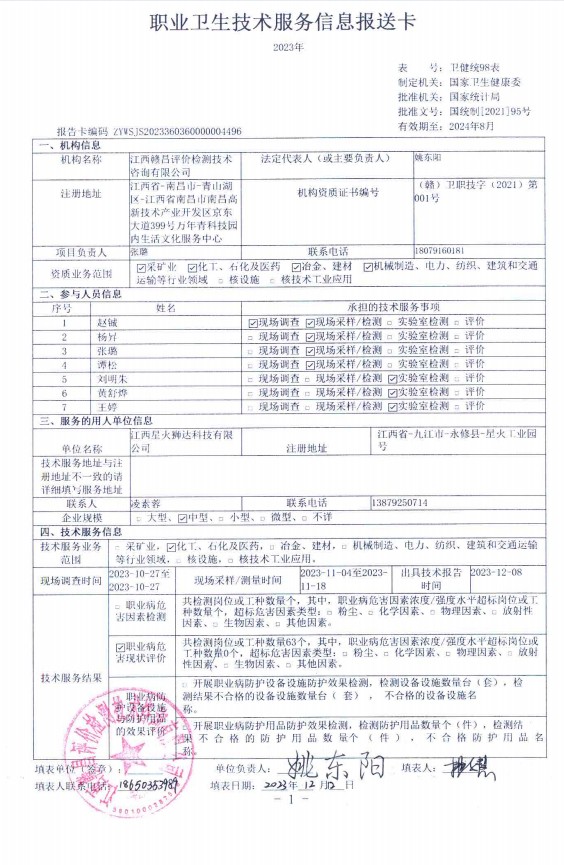 江西星火獅達科技有限公司工作場所職業(yè)病危害因素檢測報告