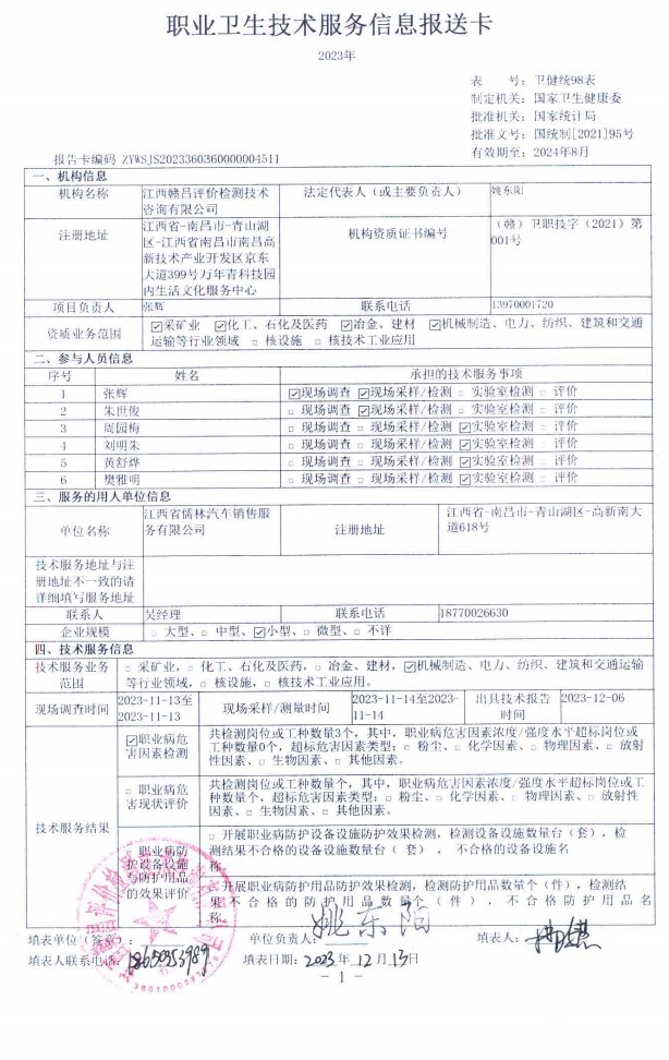下一篇:江西致勝汽車服務(wù)有限公司工作場(chǎng)所職業(yè)病危害因素檢測(cè)報(bào)告