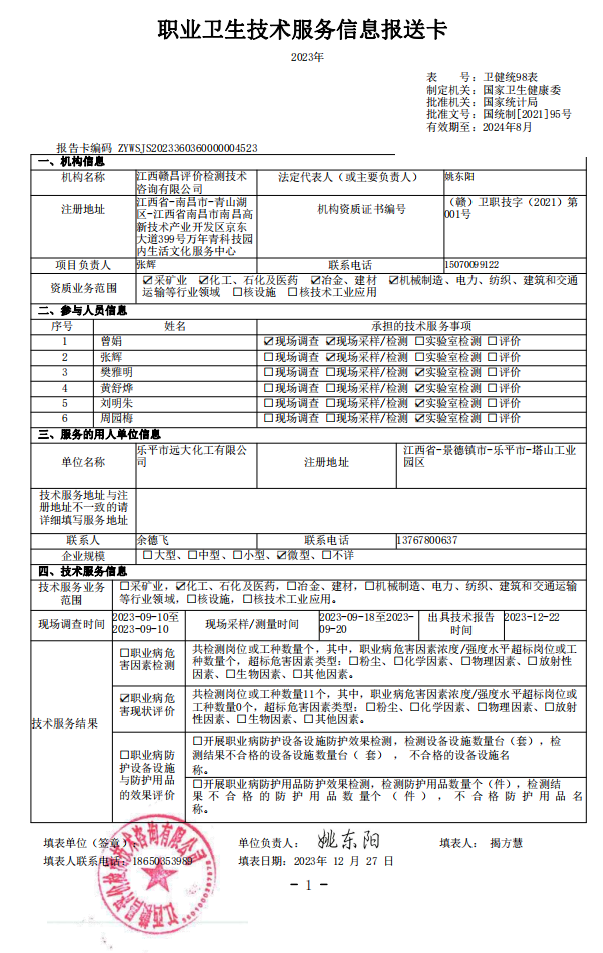 樂平市遠(yuǎn)大化工有限公司工作場所職業(yè)病危害因素檢測報(bào)告