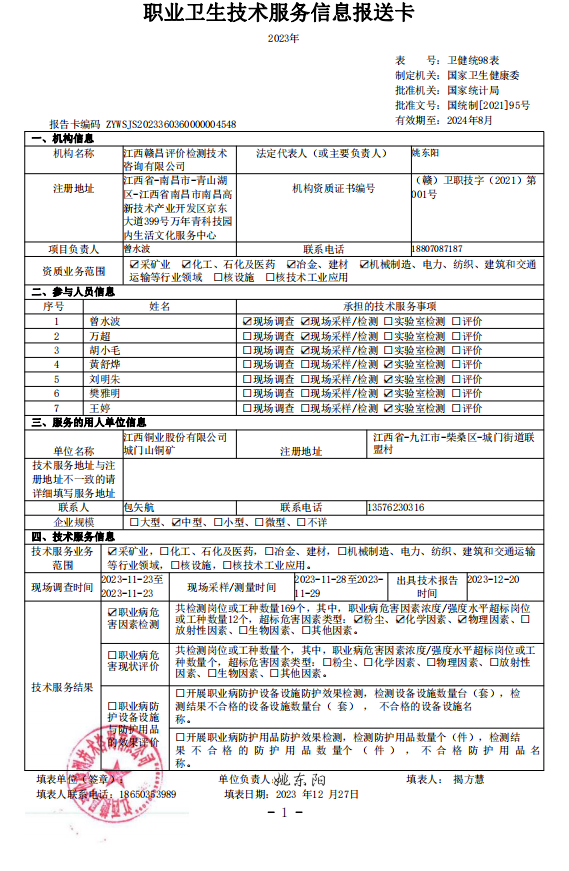 江西銅業(yè)股份有限公司城門山銅礦工作場所職業(yè)病危害因素檢測報告