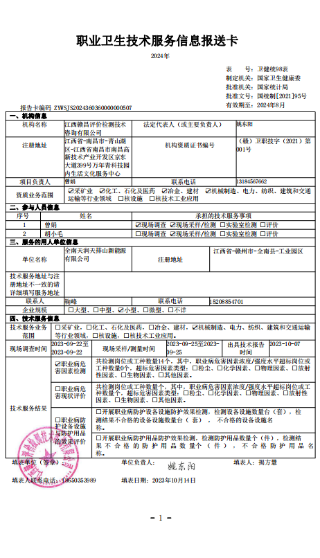 全南天潤天排山新能源有限公司工作場所職業(yè)病危害因素檢測報(bào)告