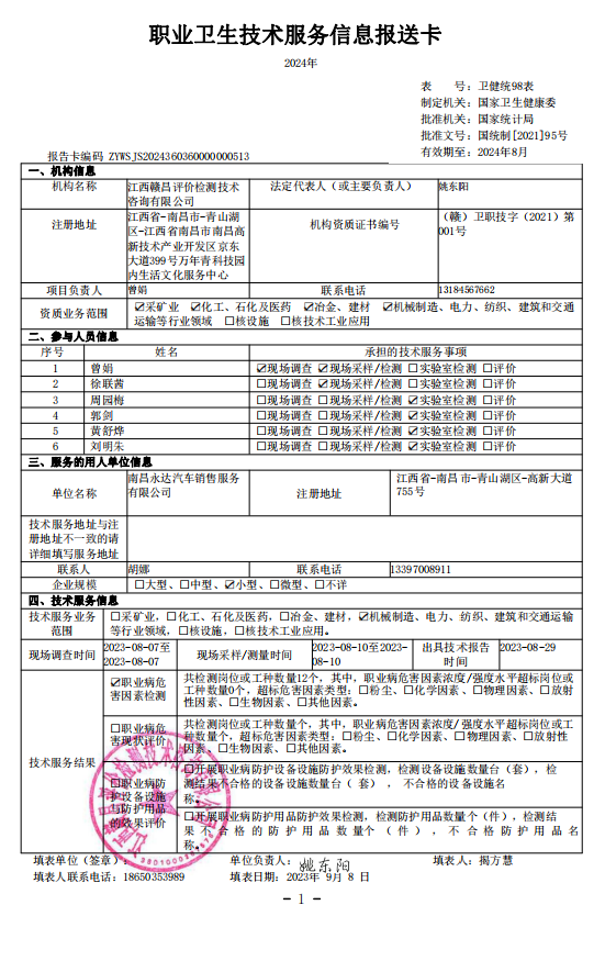 南昌永達(dá)汽車銷售服務(wù)有限公司工作場所職業(yè)病危害因素檢測報告