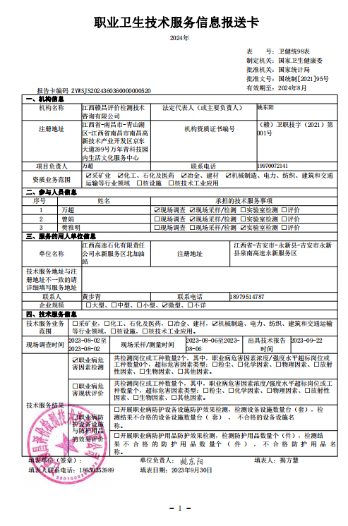 江西高速石化有限責任公司永新服務區(qū)南加油站工作場所職業(yè)病危害因素檢測報告