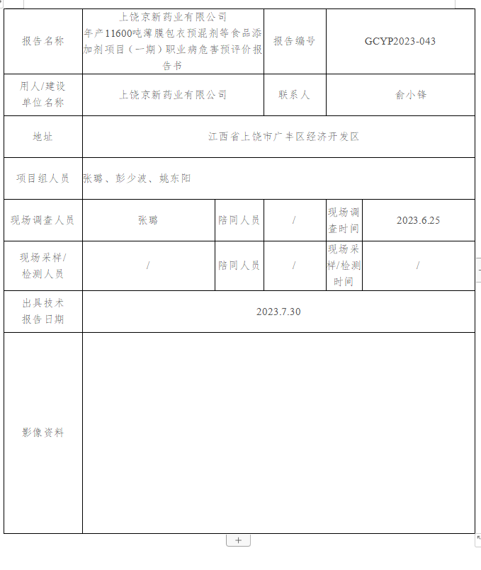 上饒京新藥業(yè)有限公司 年產(chǎn)11600噸薄膜包衣預(yù)混劑等食品添加劑項(xiàng)目(一期)職業(yè)病危害預(yù)評(píng)價(jià)報(bào)告書