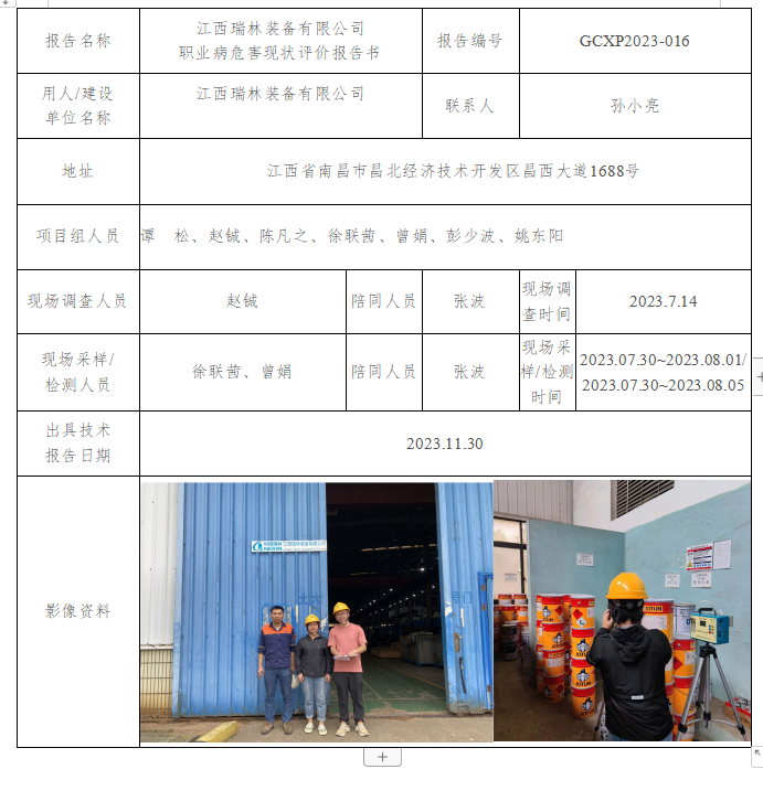 江西瑞林裝備有限公司 職業(yè)病危害現(xiàn)狀評價報告書