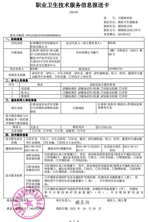 下一篇:《江西高速實業(yè)開發(fā)有限公司昌銅高速銅鼓南加油站工作場所職業(yè)病危害因素檢測報告》(報告編號:GCJC-23-152-23)