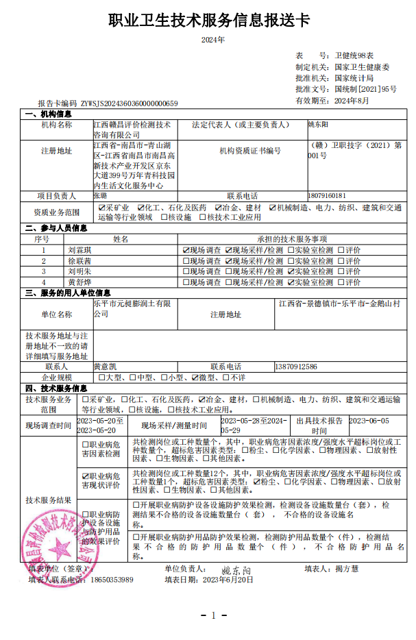 《樂平市元昶膨潤土有限公司工作場所職業(yè)病危害因素檢測報告》(報告編號:GCJC-23-082)