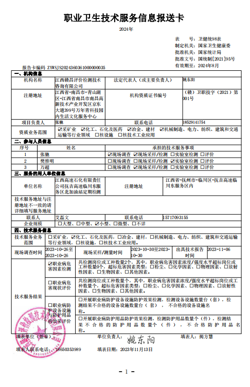 上一篇:《江西高速石化有限責(zé)任公司東昌高速撫州服務(wù)區(qū)南加油站工作場(chǎng)所職業(yè)病危害因素檢測(cè)報(bào)告》(報(bào)告編號(hào):GCJC-23-141-10)