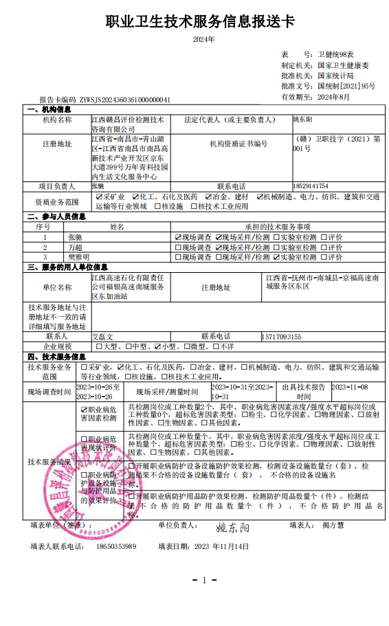 上一篇:《江西高速石化有限責任公司莆炎高速廣昌西服務區(qū)南加油站工作場所職業(yè)病危害因素檢測報告》(報告編號:GCJC-23-141-16)