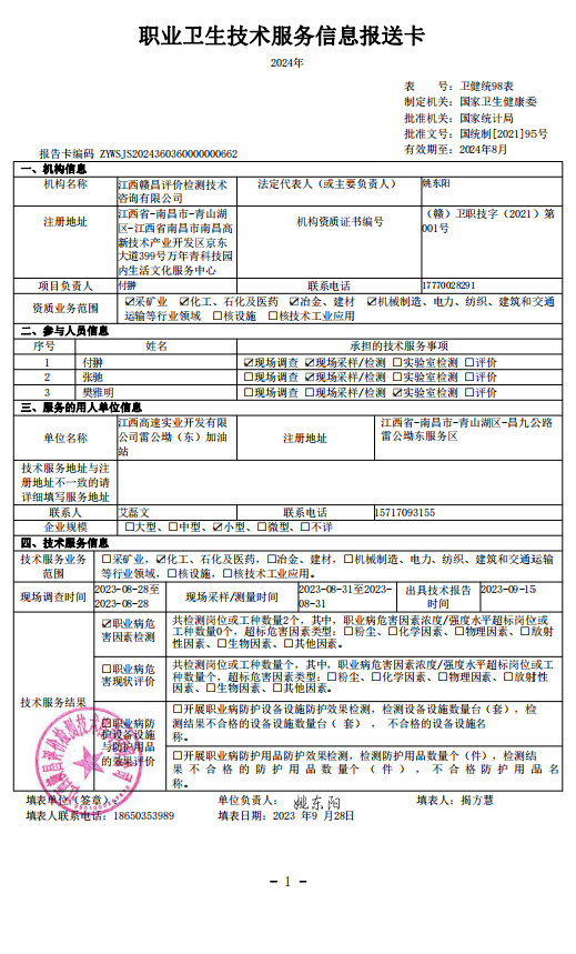 上一篇:《江西高速實業(yè)開發(fā)有限公司雷公坳(西)加油站工作場所職業(yè)病危害因素檢測報告》(報告編號:GCJC-23-152-1)