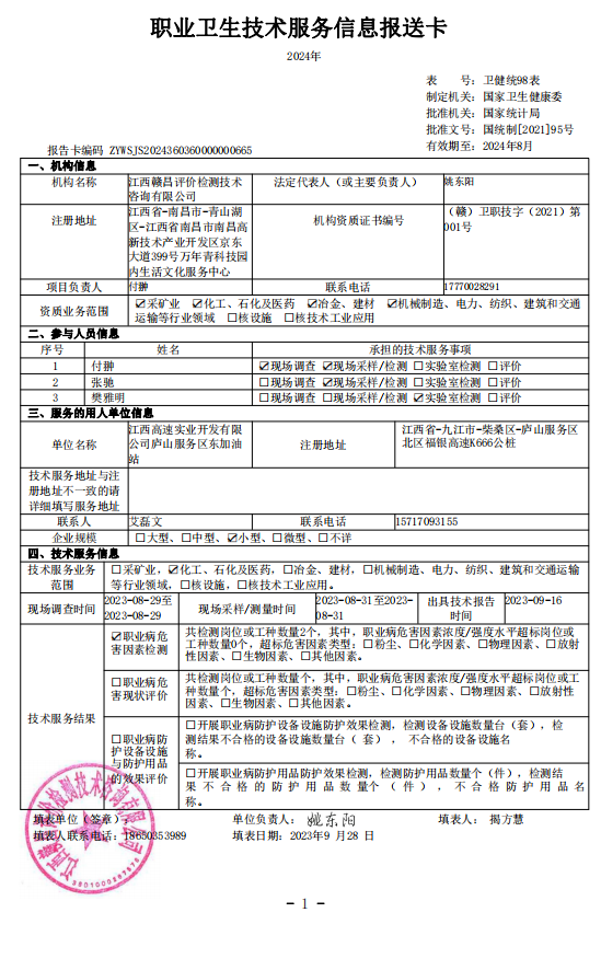 下一篇:《江西高速實(shí)業(yè)開發(fā)有限公司廬山服務(wù)區(qū)西加油站工作場所職業(yè)病危害因素檢測報(bào)告》(報(bào)告編號:GCJC-23-152-6)