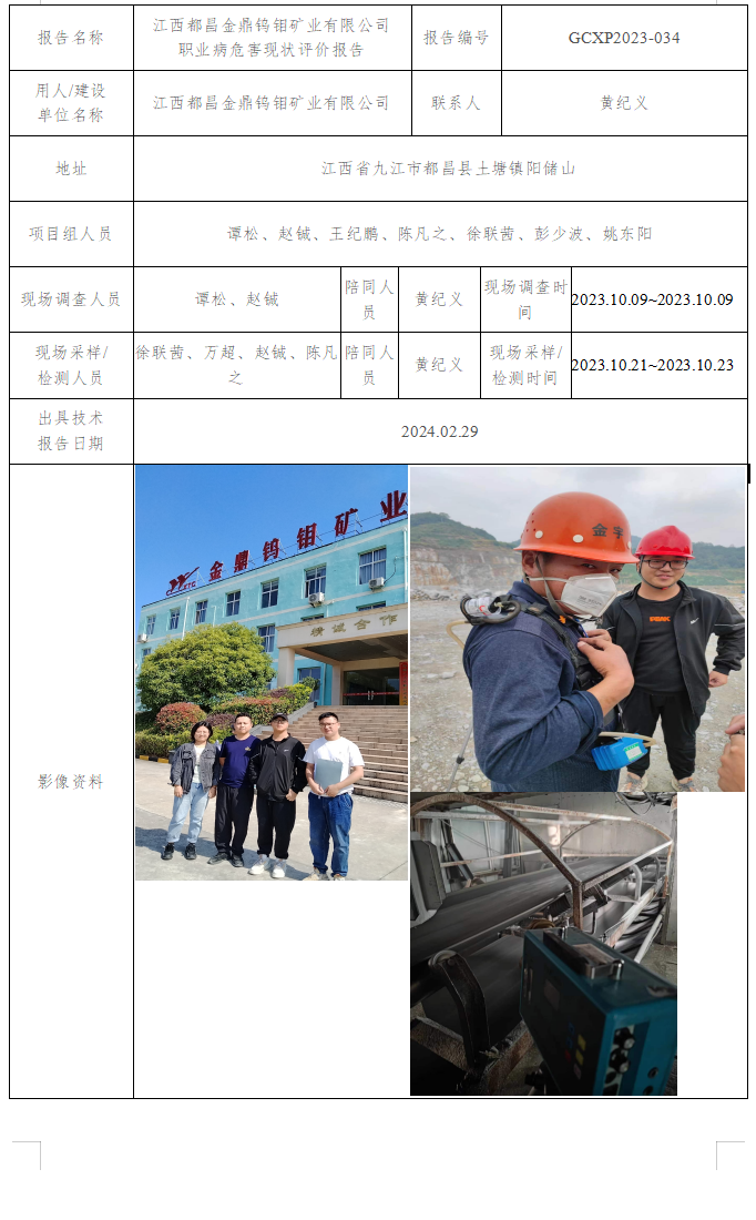 江西都昌金鼎鎢鉬礦業(yè)有限公司 職業(yè)病危害現(xiàn)狀評價報告GCXP2023-034